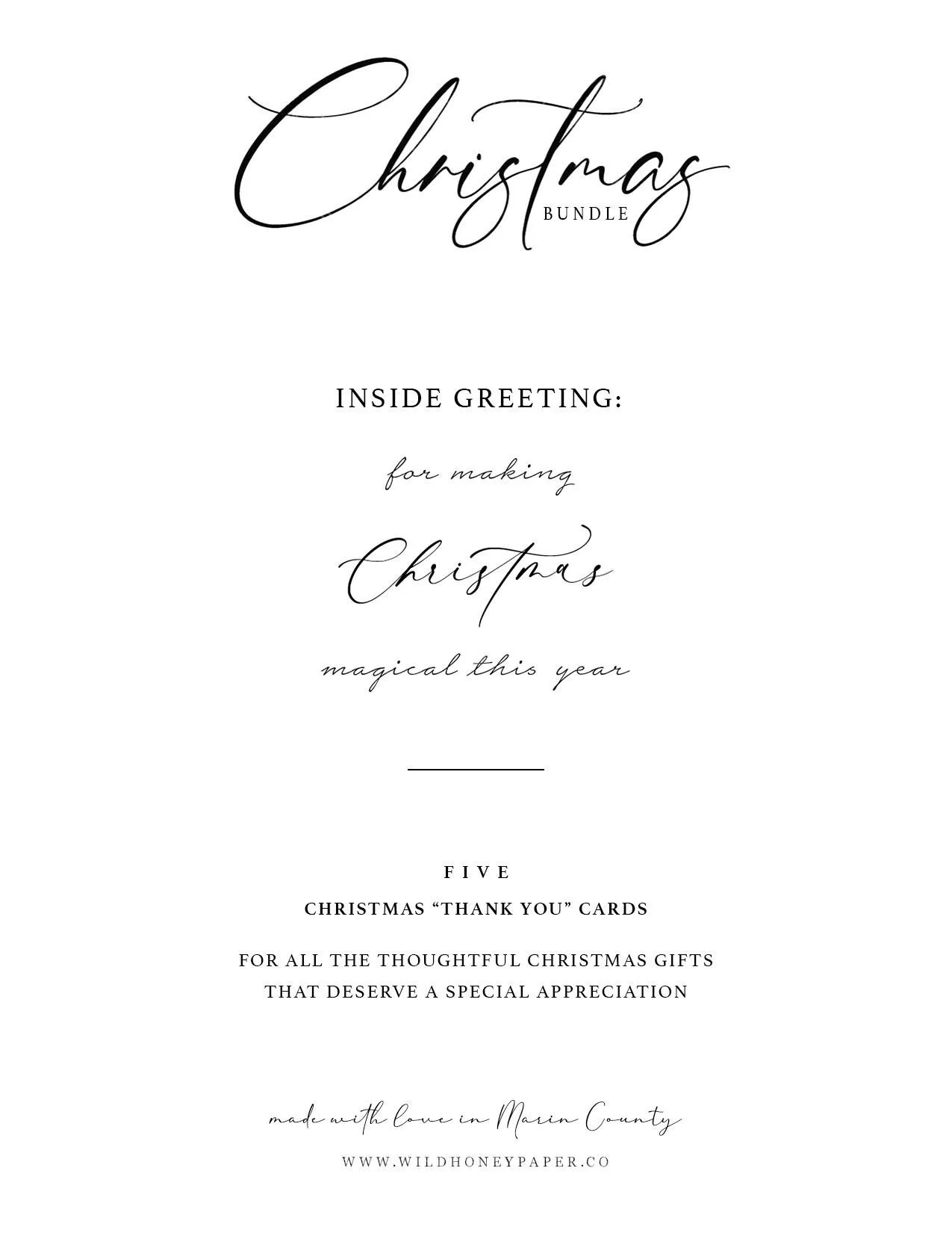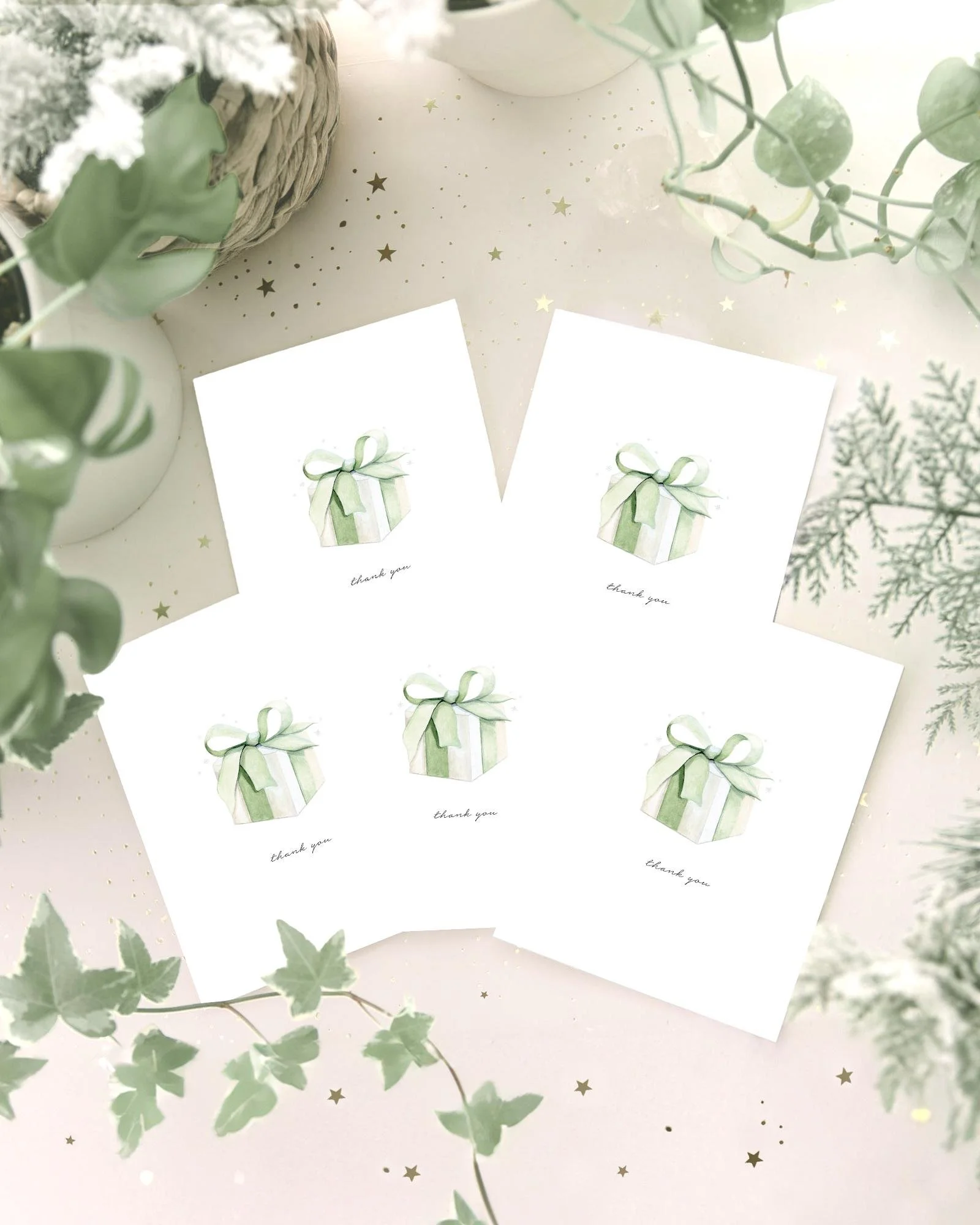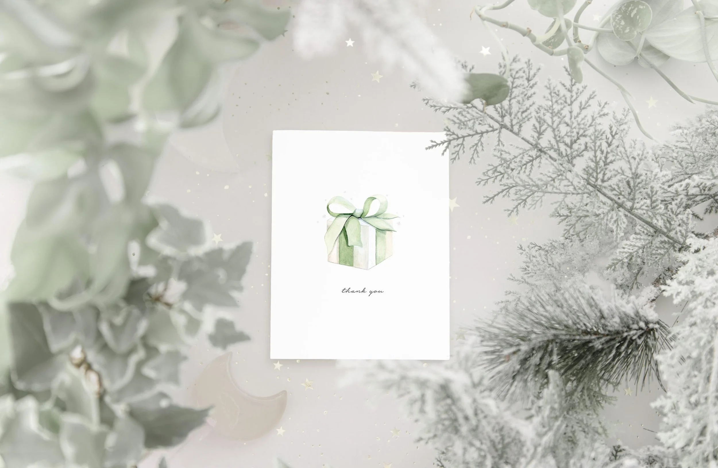 Say thank you with a touch of holiday magic! These charming cards feature a hand-painted present wrapped in festive green, perfect for expressing gratitude during the most wonderful time of the year. The simple, elegant design makes it a lovely way to show appreciation after the gift-giving season. Send warm, heartfelt thanks to those who made your holiday extra special!